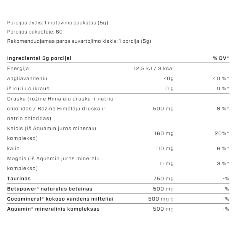 Sudedamosios dalys: taurinas, „Aquamin” mineralų kompleksas, natūralus betainas „Betapower”, „Cocomineral” kokosų vandens milteliai, rausvoji Himalajų druska, natrio chloridas, kalio citratas, sukralozė, dažiklis (kurkuminas).